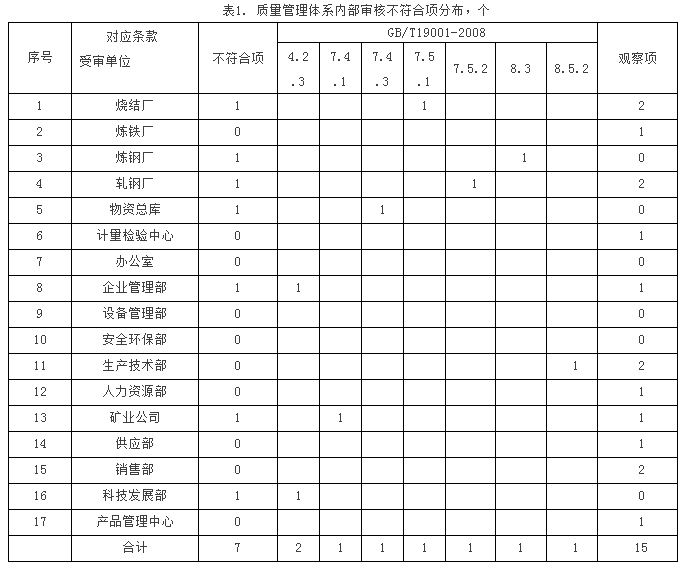公司于2013年6月14日-16日依據GB/T19001-2008標準要求順利實施了質量管理體系內部審核,受審核對象包含了17個體系內單位和公司領導層。審核組開出了7個一般不符合項和15個觀察項(見表1),不符合項對體系運行無重大影響。審核結論為“公司質量管理體系文件基本符合標準的要求,且能較好的結合實際;質量管理體系運行基本有效,可以接收第三方審核。”各責任單位對以上不符合按照《糾正措施和預防措施管理程序》按期完成了原因分析和整改措施的實施,經審核員對其有效性驗證合格后,所有不合格均按期完成閉環(huán)。