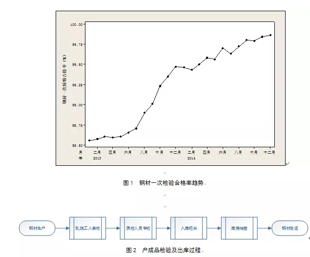 產成品質量控制方面,本公司踐行“質量源于生產”的理念,按照嚴于國家標準和行業(yè)標準的內控技術標準組織生產,鋼材一次檢驗合格率總體呈攀升態(tài)勢,并在2014年底達到了99.86%(見圖1)。為加強出廠產品檢驗把關,公司配備了先進的檢驗、試驗儀器和設備,并確保檢驗人員持證上崗。在2012-2014年省、市級質量管理部門組織的各項產品實物質量抽查中鋼材抽檢合格率為100%。