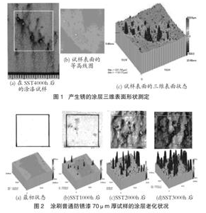 在腐蝕與防腐蝕技術(shù)教育過程中,為有助于設(shè)備維護(hù)人員對涂層老化現(xiàn)象的把握,采用鹽水噴霧試驗(yàn)法(下稱“SST”)來加速試樣涂層的腐蝕速度,并采用表面形狀三維計(jì)測技術(shù)對腐蝕狀況進(jìn)行計(jì)測試驗(yàn)。測定裝置由激光距離儀和XY工作臺構(gòu)成。圖1示出該測定裝置的測定結(jié)果。圖1(a)表示試樣可測定的范圍,(b)和(c)表示采用表面形狀三維計(jì)測技術(shù)獲得的涂層表面的等高線圖和俯視圖。由圖可知,在(a)圖中看到的黑點(diǎn)銹就是在(b)和(c)圖中鼓起高度達(dá)數(shù)百微米的黑點(diǎn)。圖2用照片和三維俯視圖示出SST隨時(shí)間變化產(chǎn)生銹的狀況。根據(jù)這些測定結(jié)果可知,所謂涂層老化現(xiàn)象是指涂料在涂層表面發(fā)生鼓起后慢慢增大,不久便從鼓起的前端產(chǎn)生流銹,然后污損周圍這樣一個(gè)過程。由于涂層會從鋼表面剝落,因此鼓起的涂料內(nèi)部會成為不利于防腐的部分。鼓起的涂料內(nèi)部產(chǎn)生的腐蝕被稱為“涂層下的腐蝕”,由此產(chǎn)生的銹和銹汁會導(dǎo)致流銹的產(chǎn)生。
