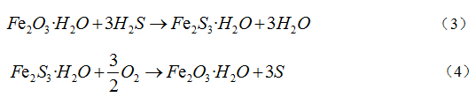 氧化鐵脫硫劑是使用最為廣泛的金屬氧化物脫硫劑,該脫硫劑原材料成本低、生產(chǎn)流程較為簡單且效率高,具有高穿透硫容和脫硫精度,普遍應(yīng)用于各類工業(yè)氣中H2S的脫除,是一種經(jīng)濟(jì)且高效的常溫脫硫劑。普遍認(rèn)為煤氣中的H2S首先吸附在鐵基脫硫劑表面,在該液膜表面進(jìn)行解離,生成H+、SH-、S2-,解離出的SH-、S2-與氧化鐵快速反應(yīng),生成Fe2S3·H2O。反應(yīng)式如(3)。另外,煤氣中氧含量一般為0~0.8%,當(dāng)煤氣中含有微量氧時(shí),脫硫產(chǎn)物與氧發(fā)生反應(yīng)生成硫單質(zhì),脫硫劑實(shí)現(xiàn)再生,反應(yīng)式如(4)[17]