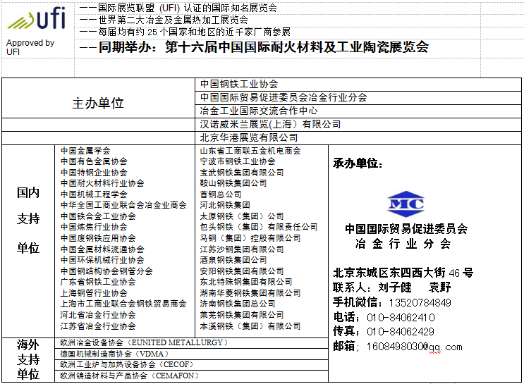 主辦方聯(lián)系人;中國(guó)國(guó)際貿(mào)易促進(jìn)委員會(huì)冶金行業(yè)分會(huì) 劉子健    13520784849