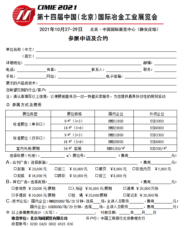 近年來,隨著“一帶一路”“中國制造2025”宏觀戰(zhàn)略的逐步實施以及高端裝備制造業(yè)“走出去”黃金時代的到來,冶金行業(yè)將迎來更為廣闊的發(fā)展契機。全新的發(fā)展環(huán)境,機遇與挑戰(zhàn)并存,如何做好新形勢下企業(yè)經(jīng)營和提高競爭力,創(chuàng)造新商機,把握新機遇成為企業(yè)最關(guān)心的問題,CIMIE2021想你所想,供你所需,緊扣市場脈搏,深度整合全新的行業(yè)資源,以全新的面貌,卓越的服務(wù),以龐大的購買群體和豐富內(nèi)容奉獻(xiàn)給與會客商。展會將全面呈現(xiàn)當(dāng)今行業(yè)發(fā)展新趨勢、新發(fā)展理念。CIMIE2021 將于10月27日在北京召開。展覽同期將舉辦高峰論壇、學(xué)術(shù)交流、采購洽談等系列活動,屆時將邀請海內(nèi)外專家學(xué)者和行業(yè)精英,共同解析行業(yè)發(fā)展形勢,共享最新科技發(fā)展成果。