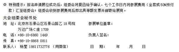 1.辦理展品運輸、報關(guān),提供優(yōu)惠住宿;2.免費提供參觀券供展商邀請客戶使用;3.凡現(xiàn)場演示需要用水、動力電、壓縮空氣的單位,須提前一個月向主場搭建商申請;4.為參展商免費刊登200字以內(nèi)企業(yè)簡介,請電郵至業(yè)務(wù)聯(lián)系人。