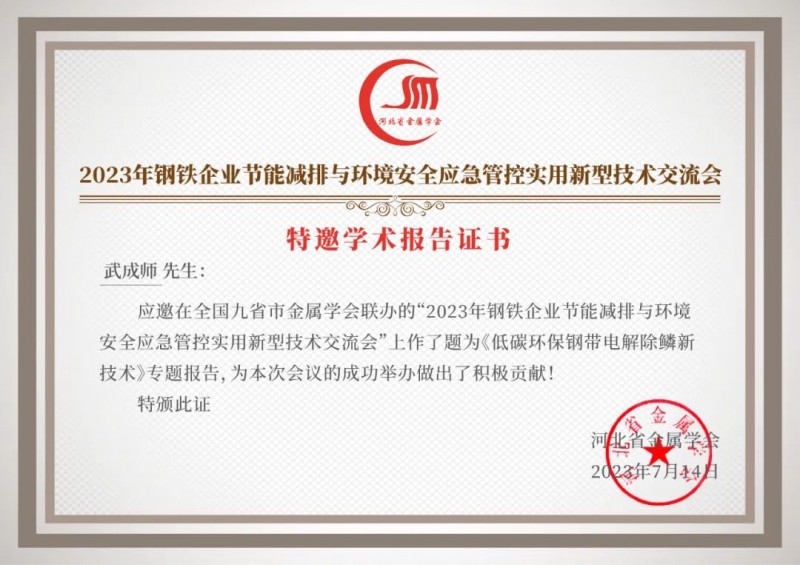 河北賽強(qiáng)冶金重工機(jī)械有限公司武成師院長(zhǎng)作《低碳環(huán)保鋼帶電解除鱗新技術(shù)》主題報(bào)告
