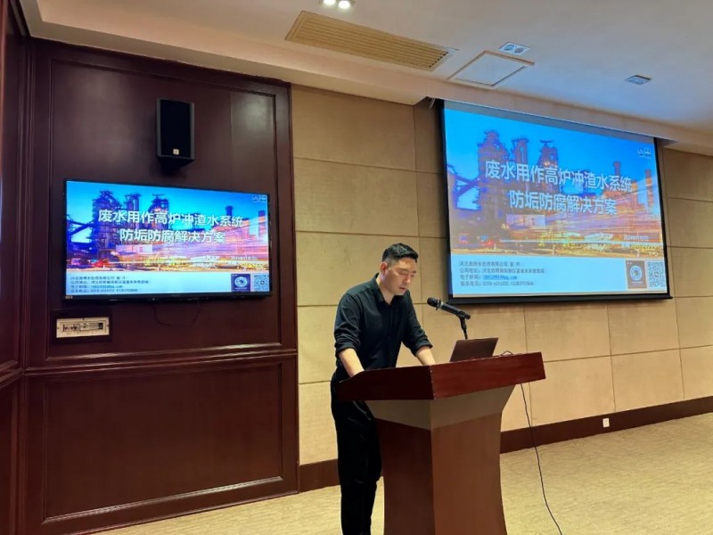 河北奧博水處理有限公司總經(jīng)理董升作《廢水用作高爐沖渣水系統(tǒng)防垢防腐解決方案》主題報告