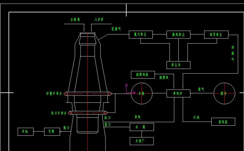 新建128m3高爐,主體車間包括車間內(nèi)部原、燃料貯運(yùn)、上料系統(tǒng)、爐頂裝料設(shè)備、熱風(fēng)爐系統(tǒng)、爐體系統(tǒng)、風(fēng)口平臺(tái)、出鐵場(chǎng)、粗煤氣處理等。還設(shè)有鼓風(fēng)機(jī)站、煤氣干法除塵、槽上和地溝除塵等輔助工段。爐渣實(shí)行輪法或水沖渣處理。