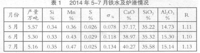2014 年高爐操作上逐步提高爐渣堿度,鐵水物理溫度穩(wěn)定在1480℃以上,鐵水含硅量實現(xiàn)穩(wěn)中有降,鐵水硫含量穩(wěn)定在一類水平。2014 年儲鐵式大溝4 月底投入使用到7 月底大修期間鐵水及爐渣情況如表1。儲鐵式大溝的通鐵量達到了16.03 萬噸,屬于國內(nèi)較好的使用水平.