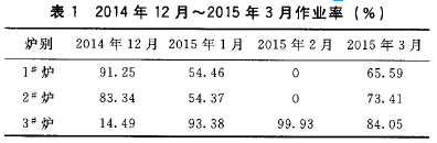 從2014年12月初起,10 m。豎爐電除塵器檢修一個川后,受高爐爐況波動用料需求不足及煤氣平衡的影響,3座豎爐經(jīng)常交替停產(chǎn)。這種間斷生產(chǎn)造成豎爐整體溫度低,熱量不足,導(dǎo)致球團礦的焙燒溫度不夠,從而強度下降。各月作業(yè)率如表I。