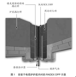 如圖1所示,透氣磚通過一個(gè)由周邊耐火磚砌成的通道安裝于電弧爐爐底內(nèi),這樣使?fàn)t底透氣磚的更換更容易,并且提高了安全標(biāo)準(zhǔn),因?yàn)闋t底搗打料的砌筑、脫氣、壓緊、燒結(jié)不影響攪拌系統(tǒng)運(yùn)行。透氣磚周圍的其余縫隙用兩種特殊的填充料填充,并被優(yōu)化達(dá)到透氣磚附近要求的特殊燒結(jié)性能。采用這種標(biāo)準(zhǔn)化的內(nèi)襯,可以達(dá)到最高的安全要求。