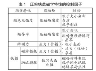 壓粉鐵芯的高密度化可有效提高磁感應(yīng)強(qiáng)度和磁導(dǎo)率。此外,為了降低渦流損耗,在粒子表面形成絕緣皮膜,使粒子間具有電絕緣性。影響壓粉鐵芯磁學(xué)特性的主要因子如表1所示。為提高壓粉鐵芯磁學(xué)特性,在磁性鐵粉開發(fā)方面,主要是開發(fā)新型鐵粉和新型絕緣皮膜。