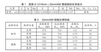 在33mm厚X80鋼板頭部、中部和尾部的寬度1/2處,取橫向樣坯檢驗拉伸性能,其具體性能如表2所示。