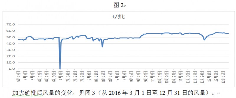 龍鋼一直因原燃料質(zhì)量和操作認(rèn)識(shí)水平,礦批一直維持在43~45.5噸,難以突破,2016年為實(shí)施低成本戰(zhàn)略,煉鐵廠尋求新的突破,從9月份開始逐步加大礦批。加大礦批過程見圖2。