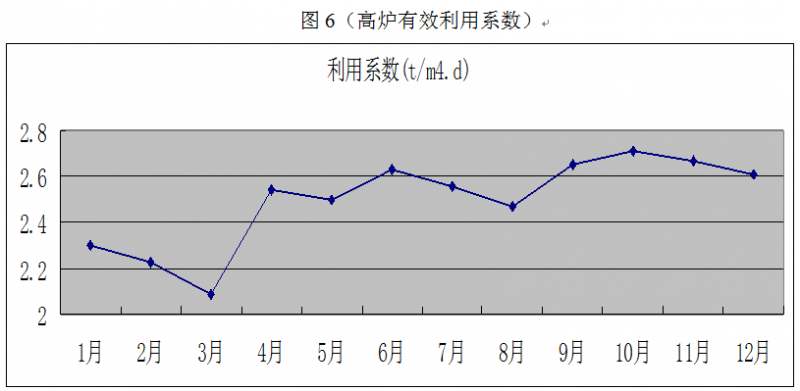 龍鋼5號(hào)高爐將批重由以前的43~45.5t擴(kuò)大到現(xiàn)在的56~57t,實(shí)行大礦批強(qiáng)化冶煉,通過實(shí)行中心加焦技術(shù),穩(wěn)定焦窗平臺(tái),實(shí)行”大α角、大礦角”布料,提高了煤氣利用,實(shí)現(xiàn)了邊緣穩(wěn)定、中心暢通的氣流,取得了良好的技術(shù)經(jīng)濟(jì)指標(biāo)(見圖6) 。