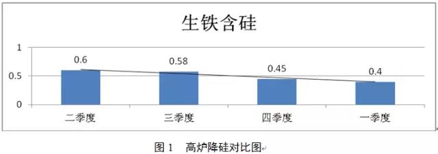 降低生鐵含硅量,有利于高爐提產(chǎn)和降低燃耗。2座高爐在爐況穩(wěn)定,物理熱≥1450,保證生鐵合格率的前提上,逐步降低生鐵含硅量,由原來的0.6%左右,穩(wěn)步降到了0.4%左右。
