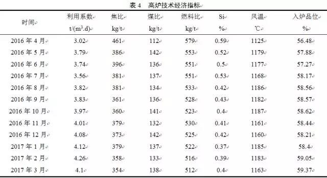 通過采取改善爐料結(jié)構(gòu),提高入爐品位,強(qiáng)化高爐操作,規(guī)范工藝管理等措施,高爐利用系數(shù)4.26t/(m3.d),燃料比512kg/t,并能長期穩(wěn)定下來,高爐實(shí)現(xiàn)了優(yōu)化技術(shù)指標(biāo)的目的。具體指標(biāo)見表4。