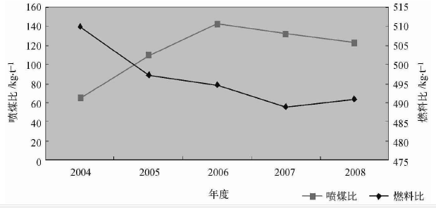 圖1首鋼2004-2008年噴煤比和燃料比變化趨勢