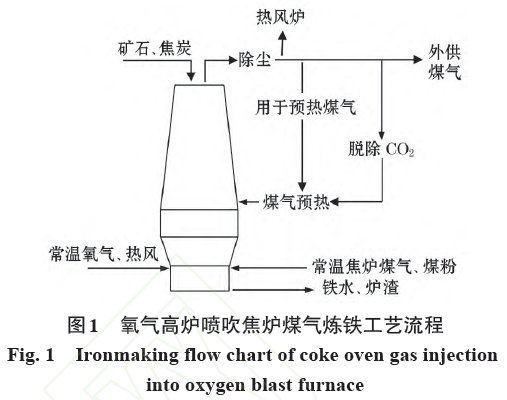 圖1 所示為氧氣高爐噴吹焦?fàn)t煤氣工藝流程。其特點(diǎn)是:(1)常溫純氧與1 200 ℃熱風(fēng)混合由爐缸風(fēng)口噴入高爐;(2)爐缸風(fēng)口同時(shí)噴入大量煤粉和常溫焦?fàn)t煤氣代替焦炭;(3)爐頂煤氣脫除H2O和CO2并預(yù)熱到900 ℃后由爐身下部輔助風(fēng)口噴入高爐,實(shí)現(xiàn)還原劑循環(huán)利用;(4)外供一部分煤氣。