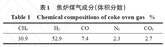 氧氣高爐噴吹焦?fàn)t煤氣煉鐵流程能質(zhì)平衡數(shù)學(xué)模型計(jì)算以高爐系統(tǒng)為研究對(duì)象,以生產(chǎn)1 t 鐵水消耗的原燃料為單位,原燃料成分與參考文獻(xiàn)[15]中的一致。新流程需要向爐缸噴入焦?fàn)t煤氣,其成分見表1,焦?fàn)t煤氣中還含有少量CnHm、苯、焦油、萘等雜質(zhì),因其體積分?jǐn)?shù)較少,且噴入高爐后會(huì)分解為CO和H2,計(jì)算中均忽略不計(jì)。