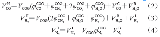 式中:VTG 為爐頂煤氣總量,m3;β 為H2在高爐下部的利用率,取0.4;α 為H2在高爐上部的利用率,取0.25;φTGH2、φTGN2和φTGCO 分別為爐頂煤氣中H2、N2和CO的體積分?jǐn)?shù);V KCO、V KH2和V KN2分別為焦炭揮發(fā)分中CO、H2和N2的體積,m3;V DRCO 為直接還原生成的CO體積,m3;V IRCO 為間接還原消耗的CO體積,m3。