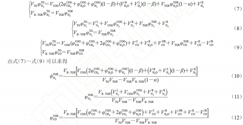 處理后循環(huán)煤氣成分的計(jì)算,根據(jù)爐頂煤氣、脫除H2O和CO2前后H2、N2、CO守恒,每個(gè)成分可以分別列出兩個(gè)獨(dú)立方程,據(jù)此可以解得循環(huán)煤氣中H2、N2、CO氣體的體積分?jǐn)?shù),所列方程組見式(7)~式(12)。