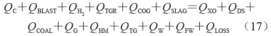 式中:QC 為碳素氧化放熱,kJ;QBLAST 為熱空氣帶入的熱量,kJ;QH2為H2氧化放熱,kJ;QTGR 為爐身循環(huán)煤氣帶入的物理熱,kJ;QCOG 為焦?fàn)t煤氣氧化放熱,kJ;QSLAG 為成渣熱,kJ;QXO 為氧化物分解耗熱,kJ;QDS 為脫硫吸熱,kJ;QCOAL 為煤粉分解耗熱,kJ;QG為爐渣帶走熱量,kJ;QHM 為鐵水帶走熱量,kJ;QTG為爐頂煤氣帶走熱量,kJ;QW 水分分解耗熱,kJ;QFW 為游離水蒸發(fā)耗熱,kJ;QLOSS 為熱損失,kJ。