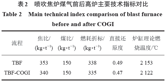 數(shù)學(xué)模型計(jì)算得出的TBF 和TBF- COGI(VCOG=30 m3/t)流程的一些主要技術(shù)指標(biāo)和爐頂煤氣指標(biāo)對(duì)比見表2和表3。