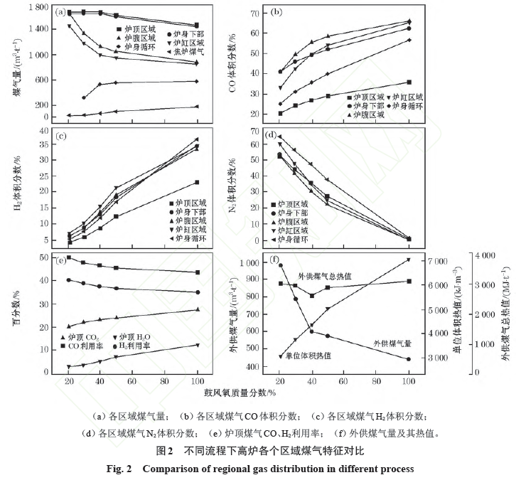 圖2(b)~(d)中隨著鼓風(fēng)氧體積分?jǐn)?shù)提高,高爐各區(qū)域CO、H2體積分?jǐn)?shù)逐漸增大,N2體積分?jǐn)?shù)則逐漸降低,爐內(nèi)還原勢(shì)提高,且爐身下部和爐頂區(qū)域CO體積分?jǐn)?shù)差距越來越大;同一富氧率下,CO體積分?jǐn)?shù)在爐腹區(qū)域最高;非全氧條件下新流程高爐各區(qū)域N2不會(huì)富集。主要是因?yàn)?,富氧鼓風(fēng)必然造成爐內(nèi)N2的減少和CO、H2體積分?jǐn)?shù)的增加,同時(shí)焦?fàn)t煤氣的噴吹也增加了CO、H2體積分?jǐn)?shù);還原勢(shì)的逐漸提高使?fàn)t身間接還原越來越充分,使煤氣由爐身下部上升到爐頂過程中CO體積分?jǐn)?shù)下降趨勢(shì)越來越明顯;產(chǎn)生于爐缸的初始煤氣在經(jīng)歷了爐缸和爐腹的直接還原后CO體積分?jǐn)?shù)達(dá)到最高值,之后煤氣與爐身風(fēng)口噴入的循環(huán)煤氣混合,使CO體積分?jǐn)?shù)在爐身下部略有減少;高爐能質(zhì)平衡模型計(jì)算得到的是高爐穩(wěn)定操作時(shí)的參數(shù)[4],也就是說,進(jìn)入高爐的N2一部分參與循環(huán),另一部分則不參與,參與循環(huán)的N2量等于爐身循環(huán)煤氣中的N2量,由鼓風(fēng)帶入的N2隨著預(yù)熱熱風(fēng)、預(yù)熱循環(huán)煤氣和外供其他系統(tǒng)排出,所以不會(huì)造成N2富集。