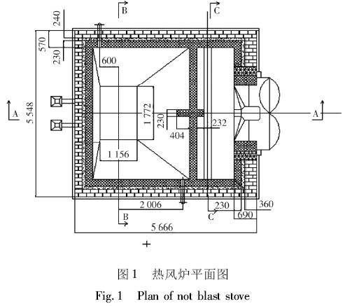 公司電石廠GXDF - 5 型熱風(fēng)爐由燃燒室、擋風(fēng)墻、副床構(gòu)成,頂為耐火材質(zhì)拱頂磚砌筑。其外形尺寸為:長5 548 mm、寬5 666 mm、高6 400 mm。燃燒室容積60 m3,副床容積為20 m3,熱風(fēng)爐平面圖及剖面圖見圖1、圖2。