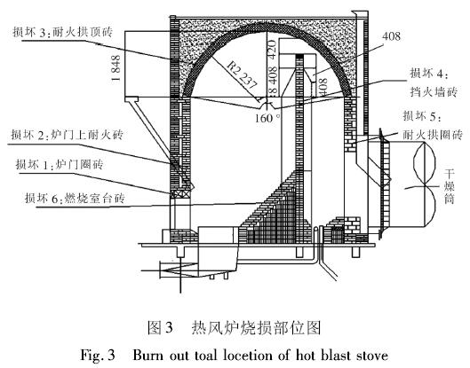 1. 2 GXDF - 5 型熱風(fēng)爐爐襯損壞的部位