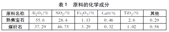 實(shí)驗(yàn)所用原料熟焦寶石和煤矸石均來(lái)自山西陽(yáng)泉,其原料成分見(jiàn)表1。