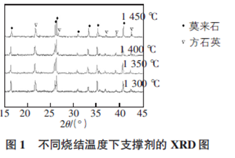 將不同燒結(jié)溫度燒結(jié)的陶粒支撐劑粉末放在載玻片上,放入XRD 設(shè)備中,分析不同溫度下制備的含有5wt% 錳粉的陶粒支撐劑物相,通過(guò)XRD 分析來(lái)確定圖中較尖銳的峰,分析結(jié)果如圖1所示。從圖1 中可以看出,陶粒支撐劑的主要物相是莫來(lái)石和方石英,并且在不同燒結(jié)溫度下支撐劑多數(shù)的物相衍射峰強(qiáng)度變化不大。1 300 ℃和1 350 ℃燒結(jié)的支撐劑,2θ 在26. 6°處未出現(xiàn)方石英的衍射峰,而1 400 ℃和1 450 ℃燒結(jié)的支撐劑具有明顯的方石英衍射峰。另外,隨著燒結(jié)溫度的升高,2θ 位于33. 2° 和40. 8°處的莫來(lái)石衍射峰強(qiáng)度增強(qiáng)。
