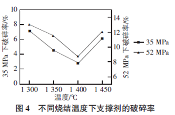 試樣的抗破碎能力是指在一定壓力下對(duì)一定體積的支撐劑進(jìn)行抗壓測(cè)試,用破碎率的高低來(lái)反映支撐劑的強(qiáng)度大小,不同的油氣井對(duì)支撐劑的破碎率要求不同,對(duì)于深層油氣井來(lái)說(shuō),就要求支撐劑有較高的抗閉合能力。圖4 是不同燒結(jié)溫度所制成的陶粒支撐劑在35 MPa,52 MPa 閉合壓力下的破碎率。從圖4中可以觀察到,在35 MPa 和52 MPa 閉合壓力下,1300 ℃燒結(jié)的陶粒支撐劑破碎率分別為7. 18% 和12. 99%,主要是與莫來(lái)石的針狀結(jié)構(gòu)和大量氣孔有關(guān)。隨著燒結(jié)溫度的升高,破碎率逐漸降低,主要是由高溫出現(xiàn)的液相使得結(jié)構(gòu)致密所致。當(dāng)燒結(jié)溫度達(dá)到1 400 ℃ 時(shí),陶粒的破碎率達(dá)到最低值,分別為2. 86% 和8. 72%,與SEM 的分析結(jié)果一致,此時(shí)的結(jié)構(gòu)最為致密,莫來(lái)石呈現(xiàn)棒狀結(jié)構(gòu),滿足行業(yè)標(biāo)準(zhǔn)的要求。燒結(jié)溫度繼續(xù)升高至1 450 ℃時(shí),陶粒的破碎率分別上升為6. 13%和12. 05%,這可能是與產(chǎn)生的閉氣孔有關(guān),不滿足行業(yè)標(biāo)準(zhǔn)要求。由此可知,陶粒支撐劑的最佳燒結(jié)溫度為1 400 ℃。