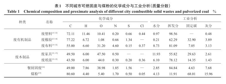 不同城市可燃固廢的化學(xué)成分與工業(yè)分析(質(zhì)量分?jǐn)?shù))見(jiàn)表1。