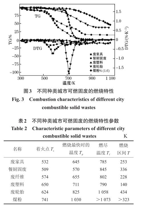 城市可燃固廢的著火點(diǎn)都低于煤粉,其中餐廚固廢的著火點(diǎn)最低,廢塑料的著火點(diǎn)最高;城市可燃固廢的燃燒速度最快時(shí)的溫度也低于煤粉,餐廚固廢的燃燒速度最快時(shí)的溫度最低,廢輪胎的燃燒速度最快時(shí)的溫度最高;城市可燃固廢的燃盡溫度也低于煤粉,廢家具的燃盡溫度最低,廢輪胎的燃盡溫度最高。