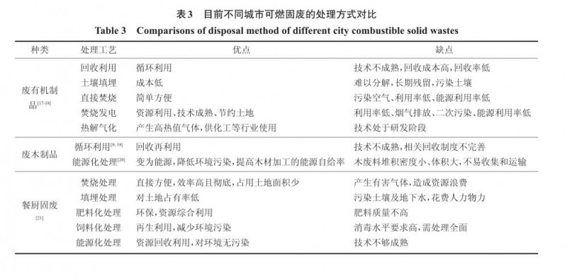 城市可燃固廢的處理方式很多,見(jiàn)表3。廢有機(jī)制品處理的方法主要分為5種:直接焚燒、焚燒發(fā)電、熱解氣化、填埋和回收再利用。采用焚燒處理,廢塑料燃燒會(huì)產(chǎn)生大量熱量,難以有效利用,利用率只有30%,會(huì)造成資源的浪費(fèi),并且燃燒過(guò)程中