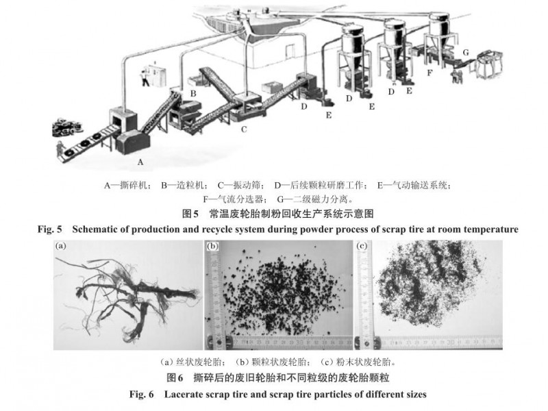 (2)制粒與輸送的可行性。城市可燃固廢的粒度是高爐噴吹的關(guān)鍵,由于城市可燃固廢多以有機(jī)物為主,傳統(tǒng)的磨煤制粒法并不適用,應(yīng)采取其他制粒方法進(jìn)行制粒,城市可燃固廢按照物理性質(zhì)可分為兩類,一種是熱塑性固廢,另一種是非熱塑性固廢。熱塑性固廢可采用熱熔水淬造粒法、軟融擠壓造粒法、微熱塑化造粒法進(jìn)行制粒 [4] ,這種制粒一般通過(guò)造粒機(jī)實(shí)現(xiàn)。圖5所示為廢舊輪胎的制粉回收流程,該技術(shù)已經(jīng)非常成熟,通過(guò)處理可獲得1~10 mm的顆粒 [39] ,如圖6所示。廢塑料和廢布料的物理性質(zhì)和廢舊輪胎相似,也可采用類似的工藝進(jìn)行混合造粒。對(duì)于非熱塑性固廢,主要以木質(zhì)生物質(zhì)為主,可采用機(jī)械粉碎進(jìn)行制粉。由于其纖維質(zhì)量分?jǐn)?shù)較高,具有一定的韌性,物料間經(jīng)碰撞而破碎的概率較小,因此不宜采用壓碎的粉碎方法,可采用鋸切粉碎、擊碎和磨碎進(jìn)行制粉,中國(guó)在此方面已開(kāi)展了多年的研究,可制得粒度為 0.074~1.000 mm不等的顆粒 [40] ,因此,廢紙張、廢家具以及餐廚固廢的處理可直接引用或者借鑒生物質(zhì)制粉技術(shù)。此外,城市可燃固廢的制粉工藝流程較長(zhǎng),占用大量用地,高爐爐前空間內(nèi)基本無(wú)法布置相關(guān)的工藝設(shè)備,因此可采用廠外制粉,然后運(yùn)輸?shù)礁郀t噴吹料倉(cāng)。