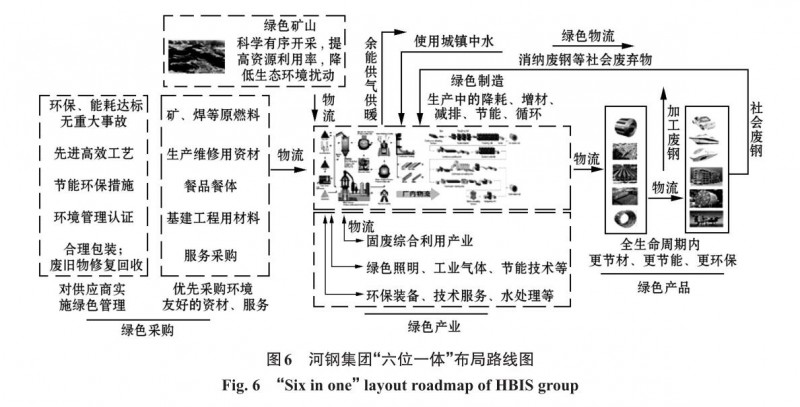 河鋼集團(tuán)圍繞“建設(shè)最具競爭力鋼鐵企業(yè)”的目標(biāo),在國內(nèi)率先提出“六位一體”總布局的綠色發(fā)展戰(zhàn)略(圖6),深入推進(jìn)綠色制造、加快發(fā)展綠色產(chǎn)業(yè)、研發(fā)應(yīng)用綠色產(chǎn)品、穩(wěn)步推進(jìn)綠色采購、系統(tǒng)優(yōu)化綠色物流、培育打造綠色礦山,確保使集團(tuán)所有子公司率先成為效益佳、效率高、消耗低、排放少、環(huán)境美的綠色鋼鐵示范企業(yè),繼續(xù)引領(lǐng)中國鋼鐵行業(yè)綠色轉(zhuǎn)型[26]。