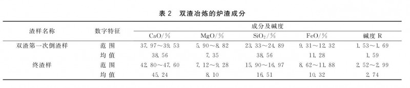雙渣冶煉的爐渣成分見(jiàn)表2 ,從表2可見(jiàn),前期按規(guī)定加入渣料,可以達(dá)到第一次倒渣的堿度要求。全鐵水冶煉或熱量富余的情況下,前期污泥球和磁選鐵可最大限度加入5000~6000kg ,二批料第一次石灰加入量為1000kg ,剩余石灰、輕燒白云石每次加500kg ,勻速加料,均勻升溫,一定要控制好過(guò)程溫度,第二批料在點(diǎn)火正常后開(kāi)始加入,如果升溫過(guò)快,立即加入磁選鐵,每次500kg ,過(guò)程少加污泥球,盡量多用磁選鐵調(diào)溫,因?yàn)槲勰嗲蚝痛胚x鐵的成分不同,作用和用法應(yīng)有所區(qū)別。
