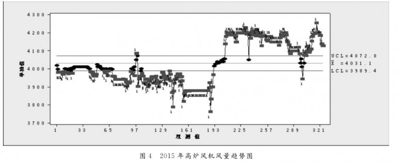 2015年底,高爐風(fēng)量增加到4200m3/min,但高爐出現(xiàn)中心、邊緣氣流均控制不住現(xiàn)象,后高爐確定送風(fēng)比2.0 ,爐容2027 m3 ,風(fēng)量定到4050m3/min,加上槽下生礦伴溫風(fēng)量約50~70m3/min,高爐定風(fēng)量到4100~4140m3/min(圖7)。