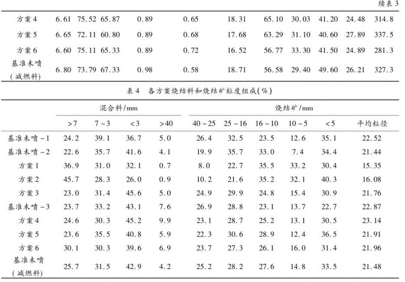 ( 2) 方案 1 比 2 的成品率高 5. 7%,說明蒸汽噴吹位置太靠前會影響成品率,這應(yīng)是由于點(diǎn)火后料層紅層相對較薄,蒸汽接觸紅層后進(jìn)行吸熱反應(yīng),導(dǎo)致表層質(zhì)量變差形成返礦。