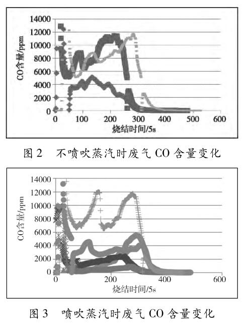 ( 1) 燒結(jié)料面噴吹蒸汽起到了降低 CO 的效果,尤其降低 CO 的效果明顯; 燒結(jié)杯條件下( 50kg 料) 噴吹蒸汽 0. 002 ~0. 032 m 3 ,CO 峰值含量降低 1 000 ~2 000 ppm 以上。
