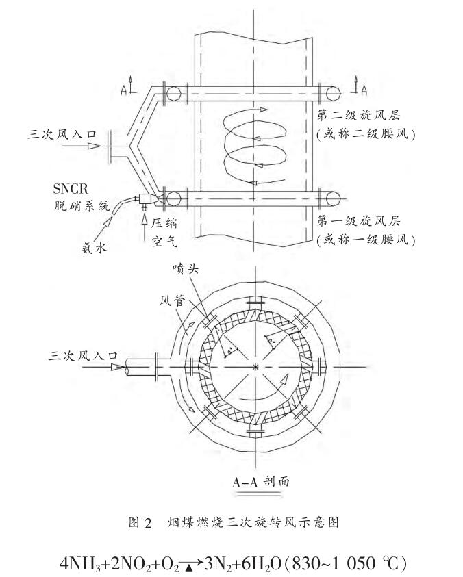 如圖 2 煙煤燃燒三次旋轉(zhuǎn)風示意圖所示, 這里強調(diào)的是:在爐內(nèi)噴氨脫硝技術(shù),必須注意如下三個方面。