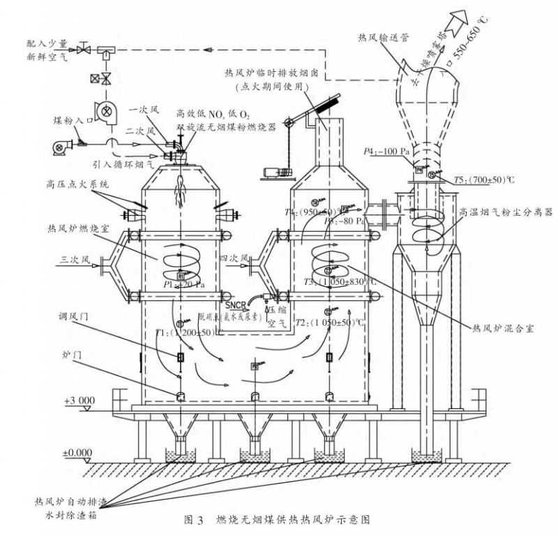 關(guān)鍵詞:潔凈煤粉熱風爐爐型;空氣分級燃燒技術(shù);高溫粉塵分離器;濕法除渣系統(tǒng)
