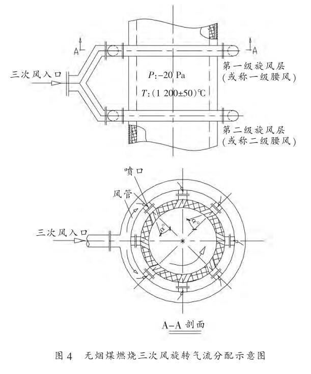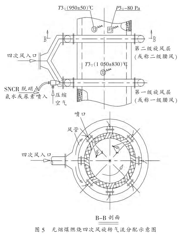 如圖 4 無煙煤燃燒三次風旋轉(zhuǎn)氣流分配示意圖所示,當這種煤粉燃燒煙氣,由立式燃燒室,經(jīng)燃燒過渡段,在后續(xù)引風機的作用下,進入第二級立式煙氣混合室。我們又設(shè)置了二層煙氣旋轉(zhuǎn)噴入口,由專用四次風機單獨供入新鮮空氣。 并在第一級旋風層內(nèi)設(shè)置了 SNCR(即選擇性非催化劑還原脫硝技術(shù))。此時的溫度窗口,煙氣與NH3混合時間與混合充分度基本滿足了脫硝要求。與前述一樣,在此的脫硝率與氧化還原的燃燒以及煙氣再循環(huán)燃燒的脫硝技術(shù),使爐內(nèi)總的脫銷率可以達到 85% 以上。