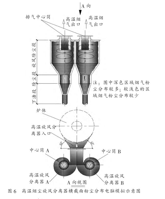 如圖 5 無煙煤燃燒四次風旋轉(zhuǎn)氣流分配示意圖所示, 通過在爐內(nèi)脫硝完成后的煙氣溫度仍有 950℃ 。 高溫煙氣進入下一級的高效高溫煙氣粉塵旋風分離器。