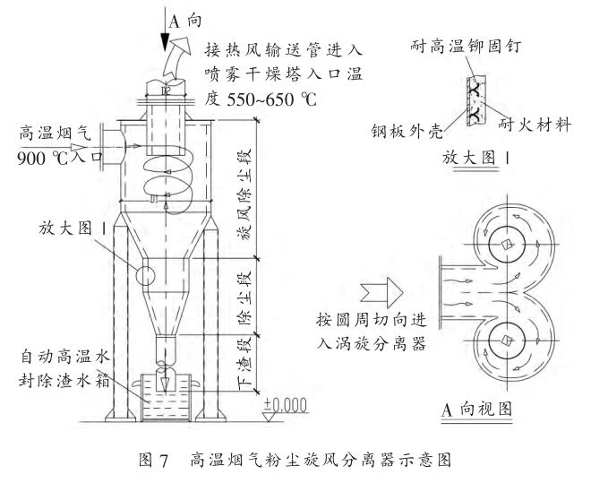 ( 2 )實際上從熱風爐過來的煙氣量都較大。 我們采用的雙筒式布置,從圖 7 可看出,整個筒體分為旋風除塵段,除塵段和下渣段。 除塵段是垂直下去,特別方便除渣。 而不至于在半熔融狀態(tài)下的粉塵粘壁下不來,從而造成高溫分離器下渣困難,導致分離效率下降。由于分離器的機體內(nèi)處于高溫環(huán)境下,整體設(shè)計時, 還要考慮鋼板的內(nèi)側(cè)與中心排氣筒耐火保溫材料,漏風系統(tǒng)等必備的設(shè)計要求。