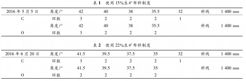 在下部調(diào)節(jié)方面,主要是追求爐缸要“活”,必須維持合理的鼓風(fēng)動能及風(fēng)速,保證爐缸初始煤氣穩(wěn)定,形成合理的透氣性及透液性.6 號高爐生產(chǎn)時間不長( 2015 年 4 月開爐) ,增加入爐生礦比例后,利用休風(fēng)機(jī)會,適當(dāng)將熱流強(qiáng)度偏低的方向風(fēng)口調(diào)大,爐缸煤氣初始分布趨于合理.同時,全部風(fēng)口角度調(diào)整為斜 5°,入爐生礦增加后,爐缸工作狀態(tài)良好,連續(xù) 2 個月未出現(xiàn)滑料現(xiàn)象.在爐缸活躍的情況下,高爐煤氣利用保持在 48. 0!以上.在上部調(diào)節(jié)方面,提高入爐生礦比例后,開始階段高爐透氣性有變差趨勢,韶鋼 6 號高爐采用平臺加漏斗的布料方式,以強(qiáng)調(diào)開放中心,穩(wěn)定邊緣的裝料制度.入爐生礦比例由 15!增加至 22!后,經(jīng)過 1 個月的生產(chǎn),上部布料作了相應(yīng)調(diào)整.調(diào)整范圍如表 1、表 2 所示.