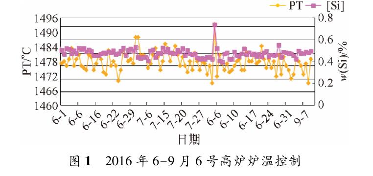 因?yàn)樯V軟化溫度低,易粘結(jié)爐墻引起爐況順行變差.生礦比例增加后,要做到低硅不低熱,須綜合運(yùn)用風(fēng)溫、富氧等手段,保證理論燃燒溫度在合適范圍,韶鋼 6 號高爐理論燃燒溫度一般在 2 150 ℃.嚴(yán)格控制好爐渣堿度,保證爐渣具有良好的流動性,要求爐渣堿度在 1. 20~1. 25.對爐渣成分及實(shí)際流動性進(jìn)行跟蹤分析,當(dāng)發(fā)現(xiàn)在爐渣溫度與鐵水含硅不匹配,渣流變差,渣中 w( Al 2 O 3 ) 含量>16!時,可以適當(dāng)配加錳礦或者白云石,以改善爐渣流動性,提高爐缸活躍度.在熱制度方面,硅按 0. 35!~0. 55!控制,鐵水含硫按 0. 020!~0. 035!控制,鐵水溫度按 1 470~1 490 ℃控制.控制好與風(fēng)壓關(guān)系匹配的頂壓,一般風(fēng)壓在 300 kPa,頂壓設(shè)置為 166 kPa,保證壓差在 130~140 kPa.爐溫控制見圖 1 所示.