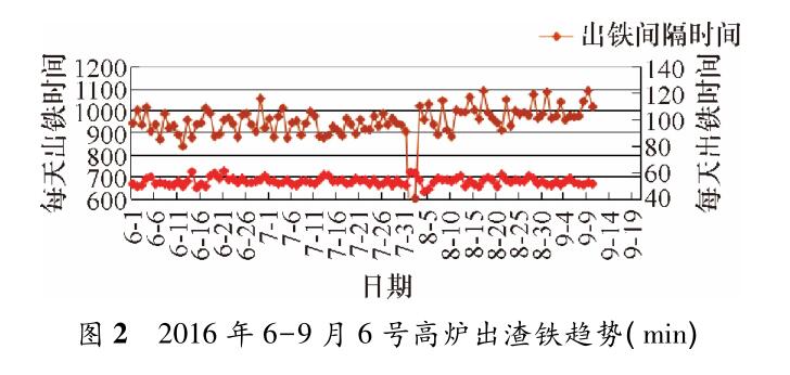 高爐出渣鐵情況的好壞,直接關(guān)系高爐的順行狀態(tài).如高爐出渣鐵狀態(tài)欠佳,高爐時常出現(xiàn)憋渣鐵現(xiàn)象,提高入爐生礦后高爐更難順行.韶鋼 6 號高爐單鐵口出鐵,出鐵間隔時間 50~55 min,日出鐵 9 爐次,日出鐵時間在 950 min 水平,一般在打開鐵口前,爐內(nèi)風(fēng)壓會明顯上升,高爐出現(xiàn)憋渣鐵現(xiàn)象,如不及時打開鐵口,高爐必然采取減氧控風(fēng)等措施.增加入爐生礦后,將出鐵間隔時間縮短至 45~50 min,日出鐵時間提高至 990 min,緩解了高爐因出渣鐵不及時引起的爐缸憋渣鐵現(xiàn)象,出渣鐵狀態(tài)持續(xù)改善,如圖 2 所示.
