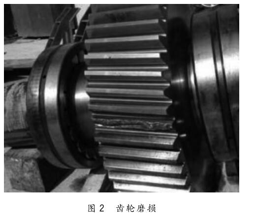 機(jī)械設(shè)備的磨損也是導(dǎo)致軋鋼設(shè)備出現(xiàn)振動(dòng)的重要原因。設(shè)備在工作時(shí),用于傳動(dòng)的關(guān)鍵零件的磨損會(huì)嚴(yán)重影響機(jī)械設(shè)備的運(yùn)轉(zhuǎn)平穩(wěn)性,如軸承和齒輪的磨損。軸承是設(shè)備旋轉(zhuǎn)過(guò)程中的關(guān)鍵零件,但由于負(fù)載和工作環(huán)境的影響,導(dǎo)致軸承發(fā)生磨損和變形,如圖 1 所示,軸承的滾珠和滾子在軸承內(nèi)圈和外圈中的運(yùn)動(dòng)位置發(fā)生變化,在傳動(dòng)過(guò)程中出現(xiàn)回轉(zhuǎn)精度低,運(yùn)轉(zhuǎn)出現(xiàn)振動(dòng)。如圖2所示,齒輪的磨損,導(dǎo)致減速器在運(yùn)轉(zhuǎn)時(shí)內(nèi)部嚙合傳動(dòng)的齒輪出現(xiàn)傳動(dòng)精度偏差,無(wú)法保持平穩(wěn)性,設(shè)備的振動(dòng)隨著傳動(dòng)鏈從動(dòng)力源到執(zhí)行件不斷被放大,導(dǎo)致軋鋼設(shè)備在末端執(zhí)行位置時(shí)的振動(dòng)現(xiàn)象尤為明顯。